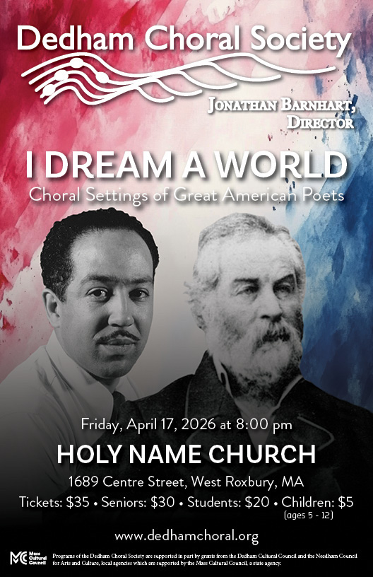 8:00 PM. Dedham Choral Society [MA]: I Dream a World. Works featuring the words of Walt Whitman and Langston Hughes, set to dramatic and lyrical music by American composers, including Howard Hanson, Ola Gjeilo, and John Michael Trotta, and accompanied by an ensemble of piano, strings and percussion. Tickets:s $35, $30 seniors $20, students, $5 5hildren (5-12). For more information, call 781-326-1520 or email info@dedhamchoral.org. Holy Name Church, 1689 Centre St., West Roxbury MA (View flier) ⓘ 🔗