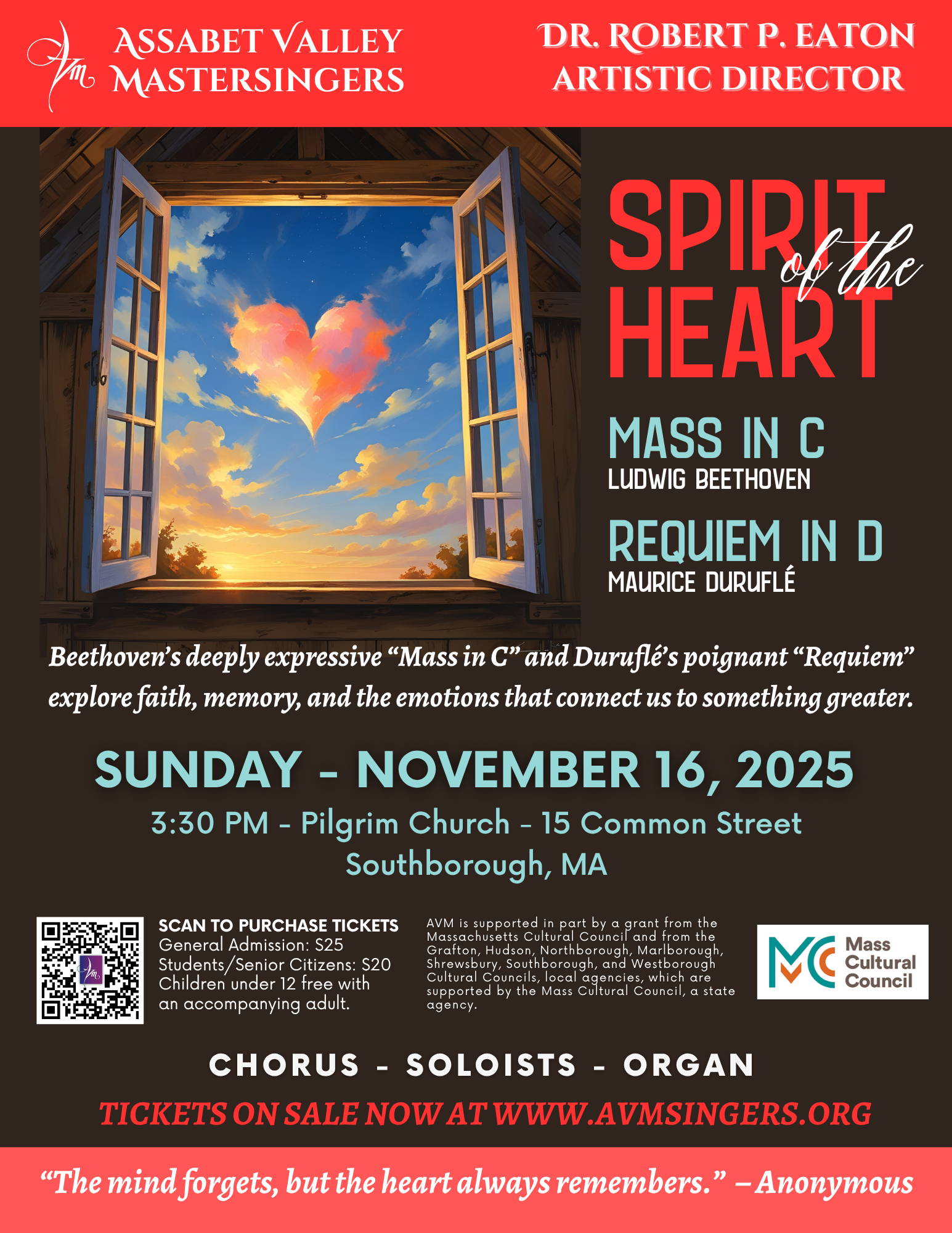 3:30 PM. Assabet Valley Mastersingers [MA]: Spirit of the Heart. Works that celebrate the strength of the human spirit. Ludwig van Beethoven: Mass in C; Maurice Duruflé: Requiem. Malinda Haslett, soprano; Catherine Hedberg, mezzo-soprano. With organ. Tickets: $25 general admission, $20 senior/student, free for children under 12 are free with an accompanying adult. For more information, call 314-495-2258 or email manager@avmsingers.org. Pilgrim Church Congregational UCC, 15 Common St., Southborough MA 01772 (View flier) ⓘ 🔗