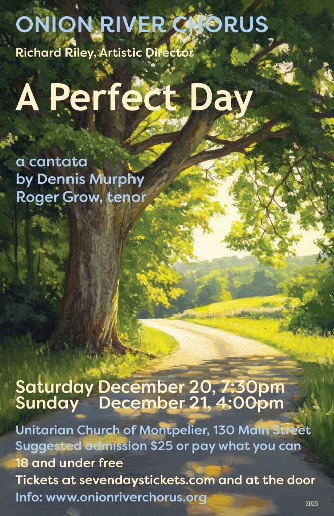 4:00 PM. Onion River Chorus [VT]: A Perfect Day. Dennis Murphy: A Perfect Day, a cantata. Roger Grow, tenor. For more information, call 802-477-3922 or email info@onionriverchorus.org. Unitarian Church of Montpelier, 130 Main Street, Montpelier VT 05602 (View flier) ⓘ 🔗