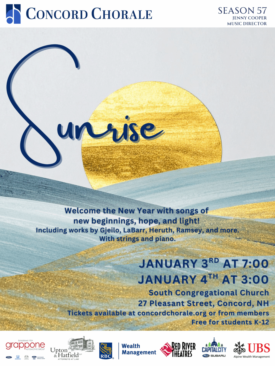 3:00 PM. Concord Chorale [NH]: Sunrise. Works by Gjello, LeBarr, Heruth, Ramsey and others. With strings and piano. For more information, call 603-333-5211 or email info@concordchorale.org. South Congregational Church, 27 Pleasant Street, Concord NH 03301 (View flier) ⓘ 🔗