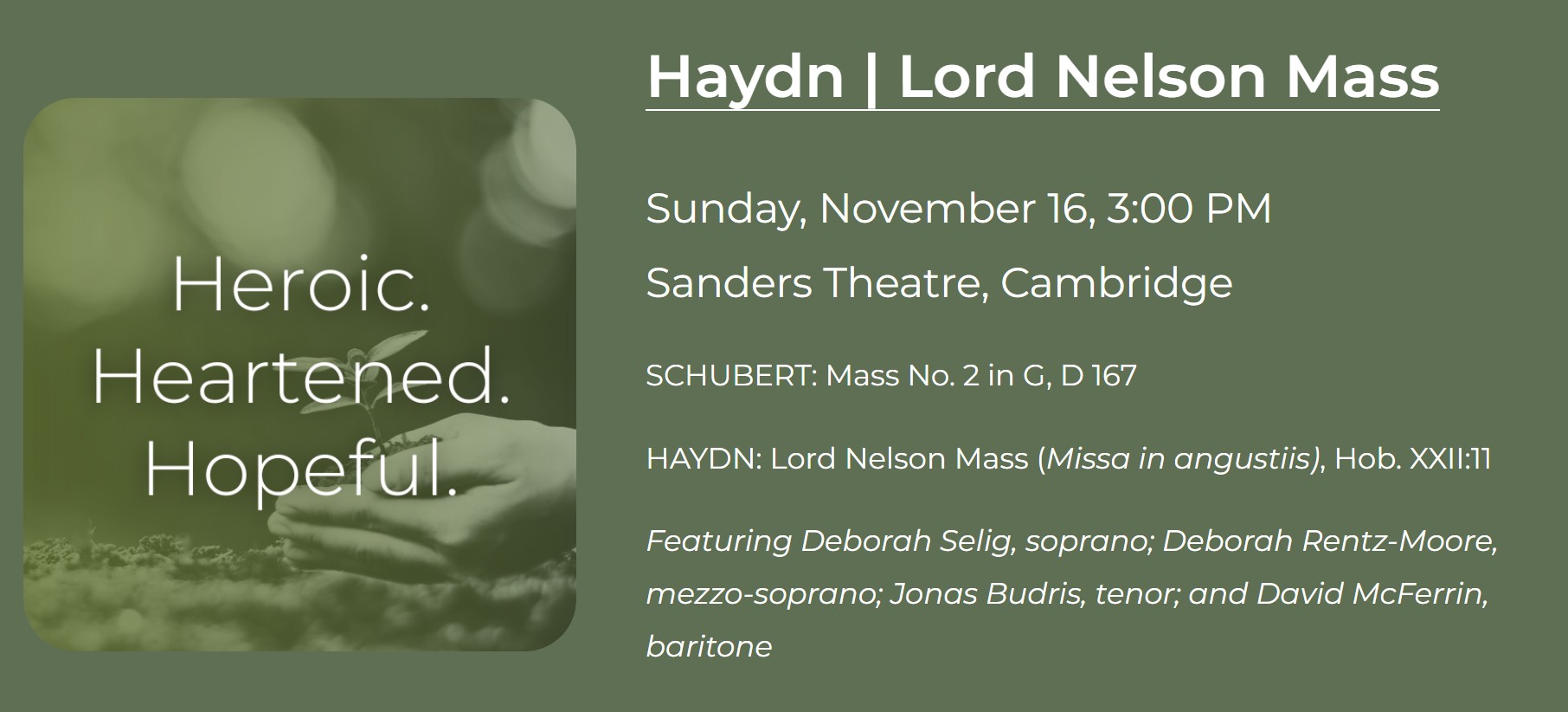 3:00 PM. Masterworks Chorale [MA]: Masterworks Chorale Fall Concert. F.J. Haydn: Lord Nelson Mass (Missa in angustiis), Hob. XXII:11; Franz Schubert: Mass No. 2 in G, D 167. Deborah Selig, soprano; Deborah Rentz-Moore, mezzo-soprano; Jonas Budris, tenor; David McFerrin, baritone; Kevin Leong, director. With full orchestra. For more information, call 617-858-6785 or email info@masterworkschorale.org. Sanders Theatre, Harvard University, 45 Quincy Street, Cambridge MA 02138 (View flier) ⓘ 🔗