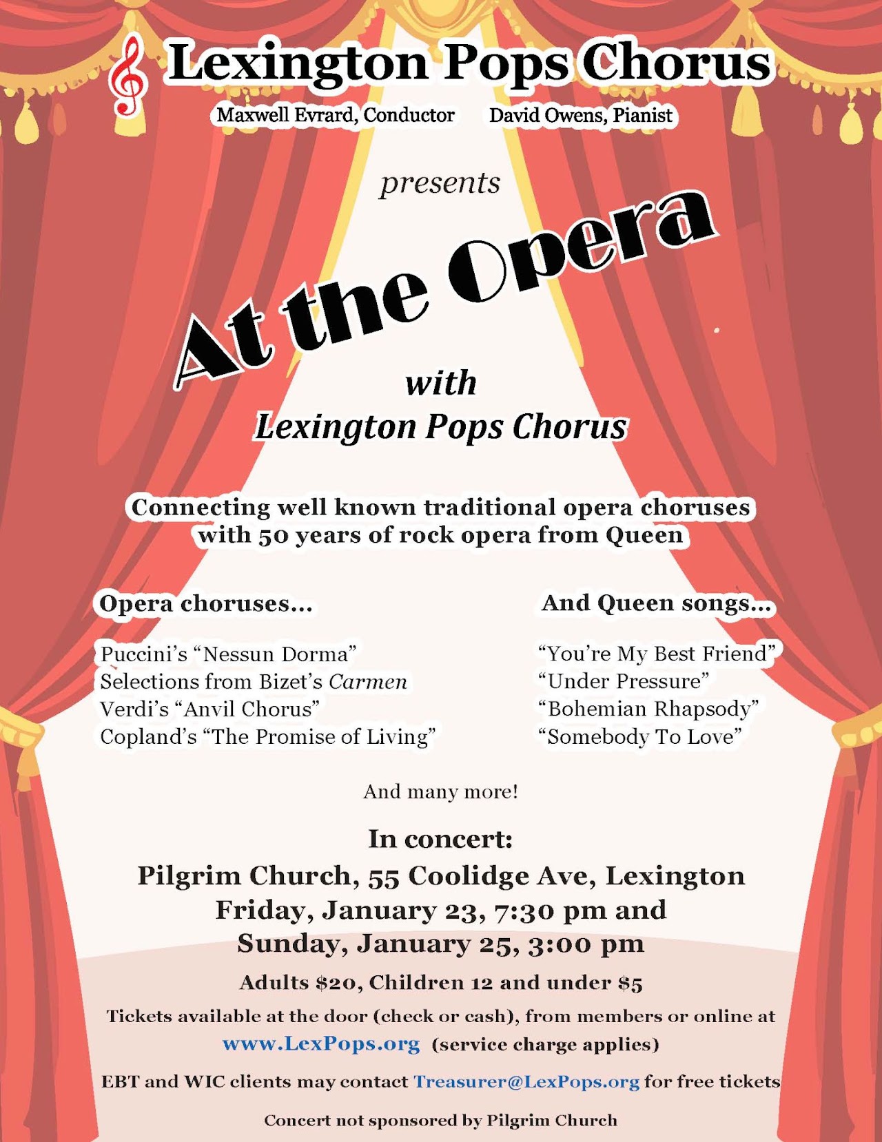 3:00 PM. Lexington Pops Chorus [MA]: At the Opera with Lexington Pops Chorus. Recognizing the 50th anniversary of legendary British rock band Queen's debut album and the release of their iconic song "Bohemian Rhapsody", and embracing Freddy Mercury's love of traditional opera, this concert connects well known traditional opera choruses with 50 years of rock opera from Queen. Tickets: $20 adult, $5 children 12 and under. For more information, call 781-801-0503 or email info@LexPops.org. Pilgrim Church, 55 Coolidge Ave, Lexington MA 02420 (View flier) ⓘ 🔗