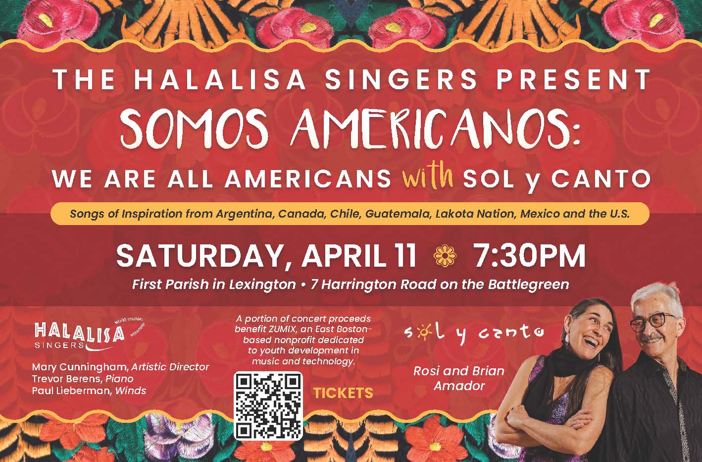 7:30 PM. Halalisa Singers [MA]: Somos Americanos (We Are All Americans), featuring Sol y Canto. Songs celebrating the Americas, including Rolando Alarcón's “Si Somos Americanos”; Consuelo Velásquez's “Bésame Mucho”; Alisa Amador's “Nudo des raíces”; the folk song “La Monja Blanca”; Leon Dubinsky's “We Rise Again”; the spiritual “Roll Down Justice”; Carly Simon’s “Let the River Run”; the Lakota song “Chante Waste Hoksila”; and traditional American tunes “Shenandoah” and “Will the Circle Be Unbroken,” as well as George Emlen and Noel Paul Stookey's arrangement of "America the Beautiful.” With Sol y Canto: vocalist Rosi Amador, guitarist/composer Brian Amador, and flutist Paul Lieberman. Trevor Berens, piano; Mary Cunningham, director. Tickets: $25. A portion of the proceeds will be donated to Zumix, an East Boston organization transforming young lives through music, technology, and creative employment. For more information, email info@halalisa.org. First Parish, 7 Harrington Road, Lexington MA 02421 (View flier) ⓘ 🔗