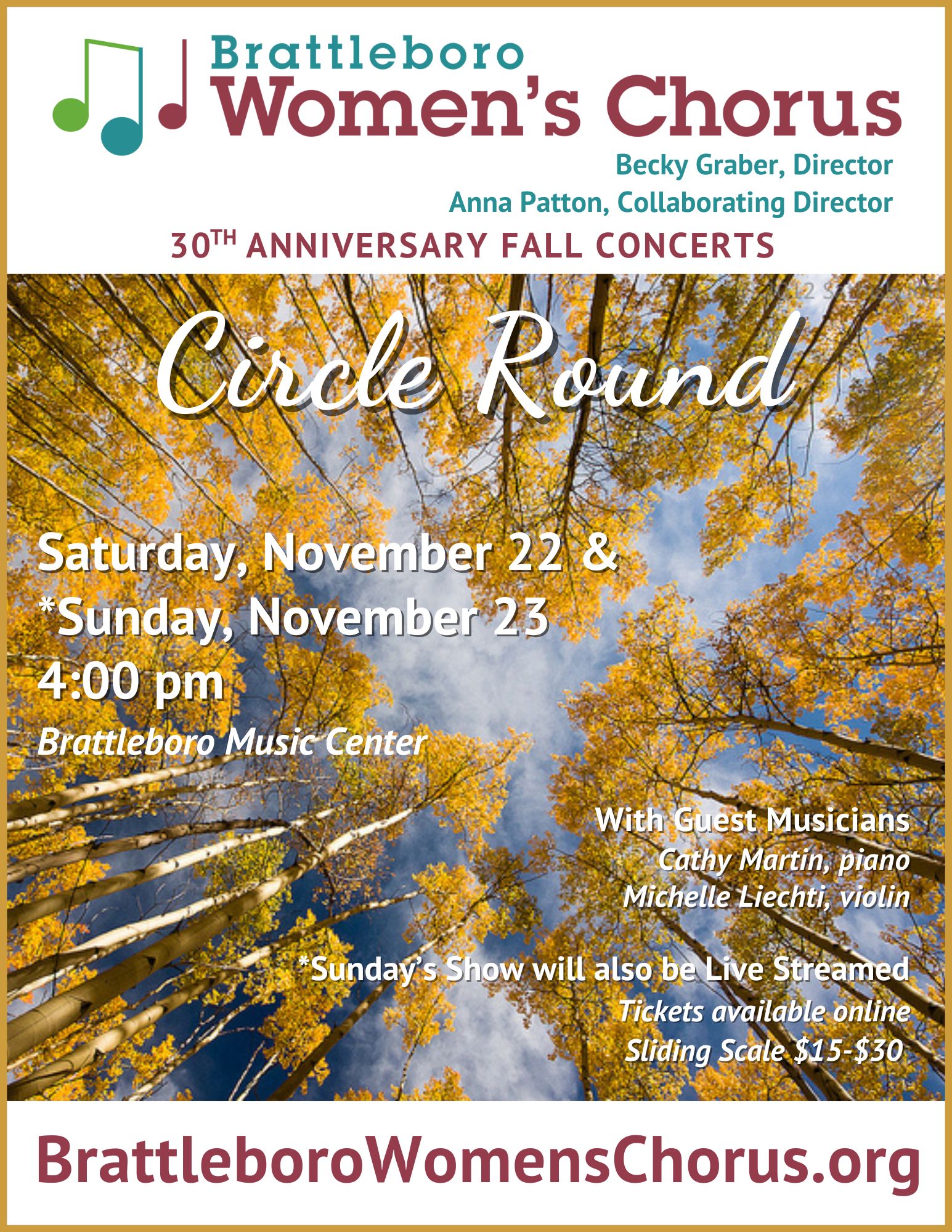 4:00 PM. Brattleboro Women's Chorus [VT]: Circle Round, Our 30th Anniversary Fall Concerts. Joan Szymko: “Here”; “Nothing Short of Grace”; Jonathan Larson: “Seasons of Love” from Rent; Linda Hirschhorn: “Ilu Finu”; “Circle Chant”; Pete Sutherland (Anna Patton, arr.): “Out to Breakfast”; original works by Becky Graber and Anna Patton; other songs that explore the power of living in community. Cathy Martin, piano; Michelle Liechti, violin; Becky Graber and Anna Patton, directors. Tickets, in-person and live stream: $15-$30, sliding scale. Sunday’s show will be live streamed and recorded. For more information, call 802-254-8994 or email info@brattleborowomenschorus.org. Brattleboro Music Center, 72 Blanche Moyse Way, Brattleboro VT 05301 (View flier) ⓘ 🔗