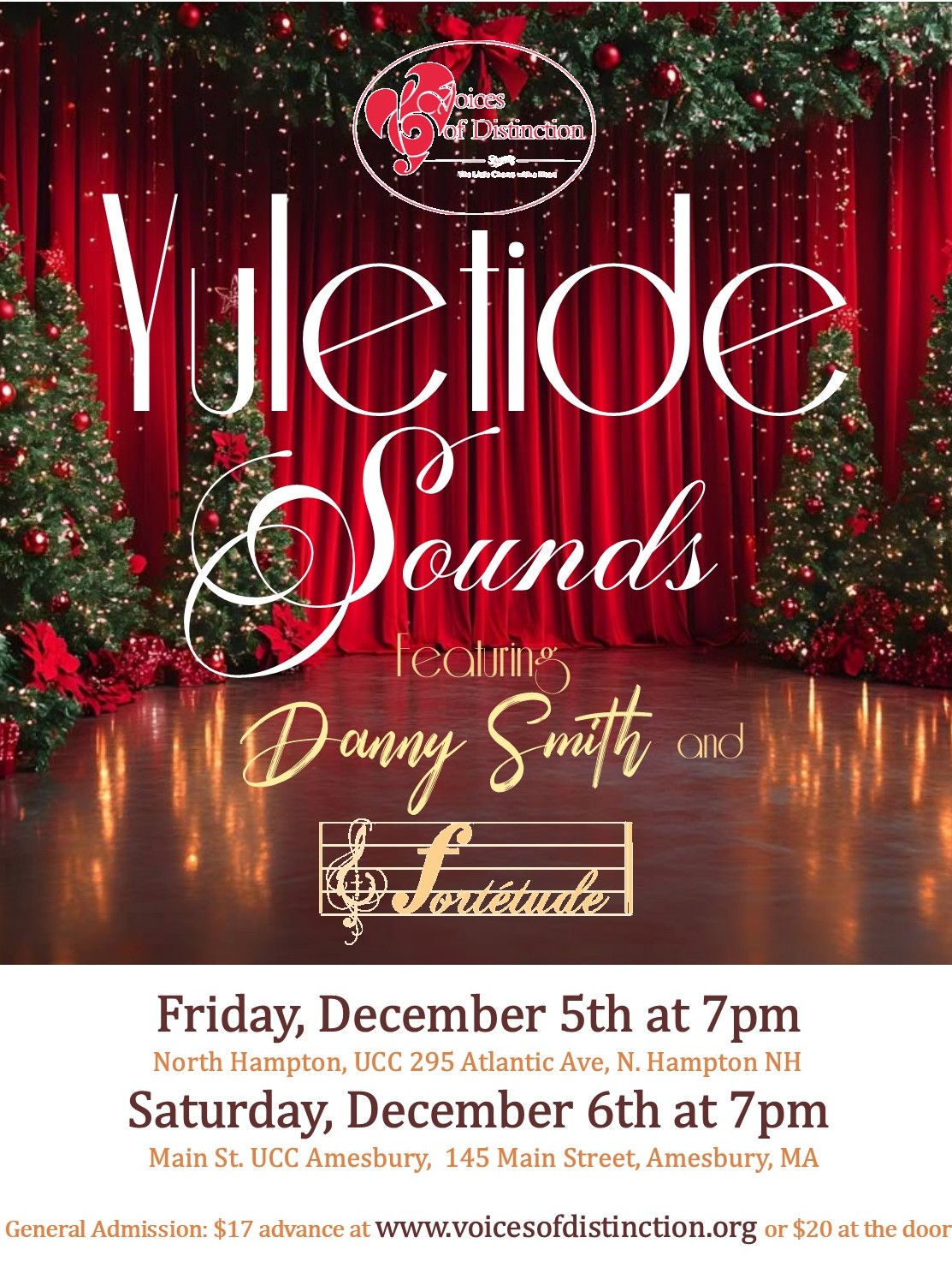 7:00 PM. Voices of Distinction [MA]: Yuletide Sounds. A rich tapestry of traditional and contemporary selections, brought to life by local professional musicians on piano, strings, and percussion. Danny Smith, Music Director. With the vocal ensemble FortEtude. Tickets: $17 advance, $20 at the door. For more information, call 603-964-8687 or email adminassistant@uccnorthhampton.org. Main Street Congregational Church, UCC, 145 Main Street, Amesbury MA 01913 (View flier) ⓘ 🔗