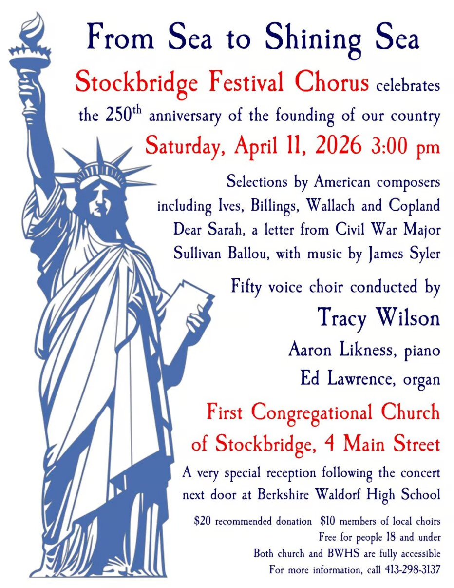 3:00 PM. Stockbridge Festival Chorus [MA]: From Sea to Shining Sea. Works by Aaron Copland, Charles Ives, Alice Parker, Moses Hogan, and local composer Larry Wallach. A special piece, “Dear Sarah,” uses a letter written by Civil War Major Sullivan Ballou to his wife just prior to his deployment to the Battle of Bull Run, where he lost his life. Tracy Wilson, conductor; Aaron Likness, piano; Ed Lawrence, organ. Reception at Berkshire Waldorf High School. Tickets: $20 adults, $10 for members of local community choruses, free for individuals age 18 and under. For more information, call 413-822-8688 or email twilson@berkshiremusicschool.org. First Congregational Church, 4 Main Street, Stockbridge MA 01262 (View flier) ⓘ 🔗