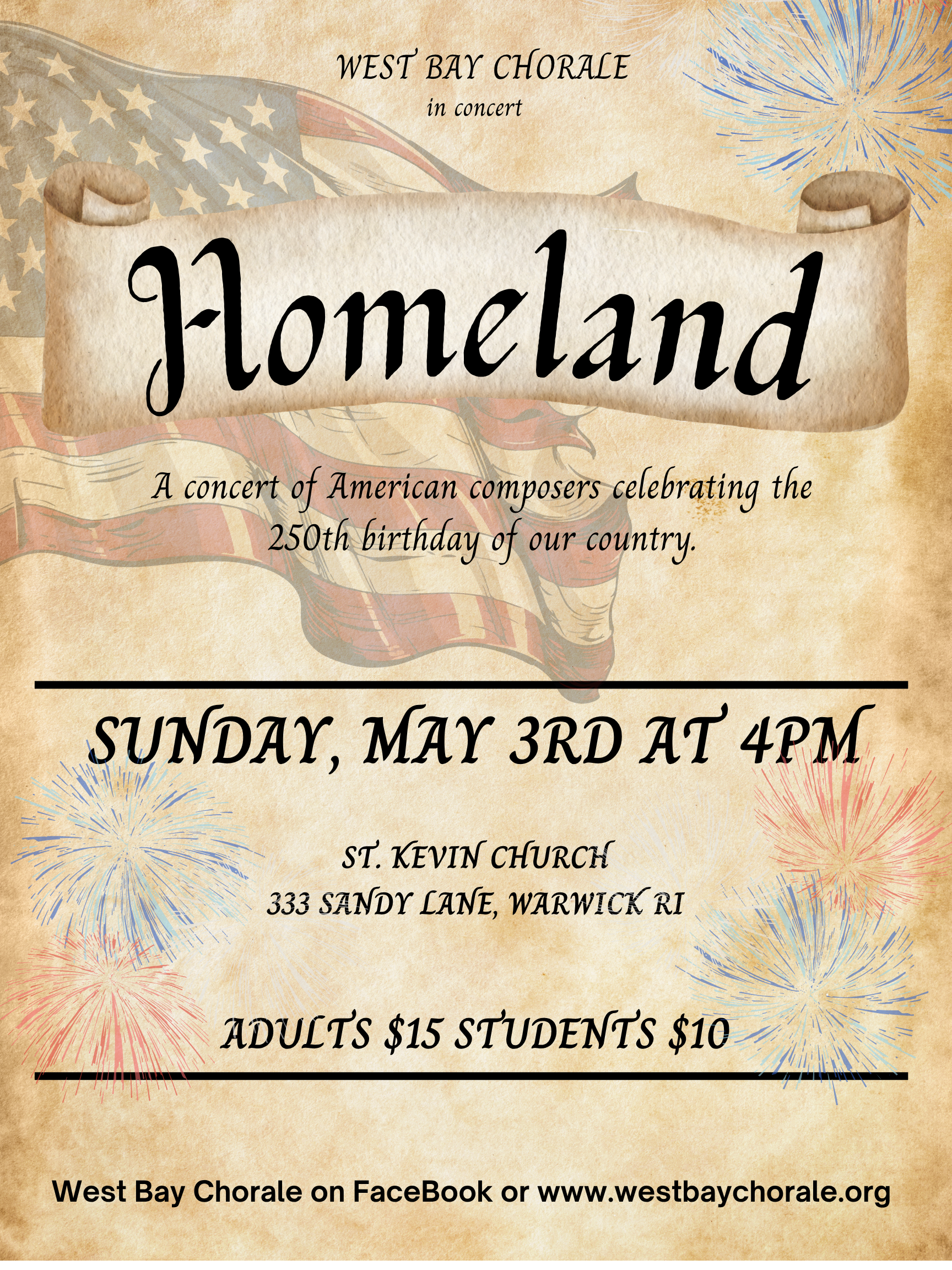 4:00 PM. West Bay Chorale [RI]: Homeland – West Bay Chorale Spring Concert. Celebrating America’s 250th anniversary, the program features music by American composers across generations, including spirituals, folk, Broadway, and contemporary works. Amanda Santo, soprano; Tony Grelle, tenor. A pre-concert photography exhibit, A"merican Scenes: America Through Our Eyes", will be on display. Tickets: $15 adults, $10 students. For more information, call 401-822-3556 or email brendan@bcrcreativerelations.com. St. Kevin Church, 333 Sandy Lane, Warwick RI 02889 (View flier) ⓘ 🔗
