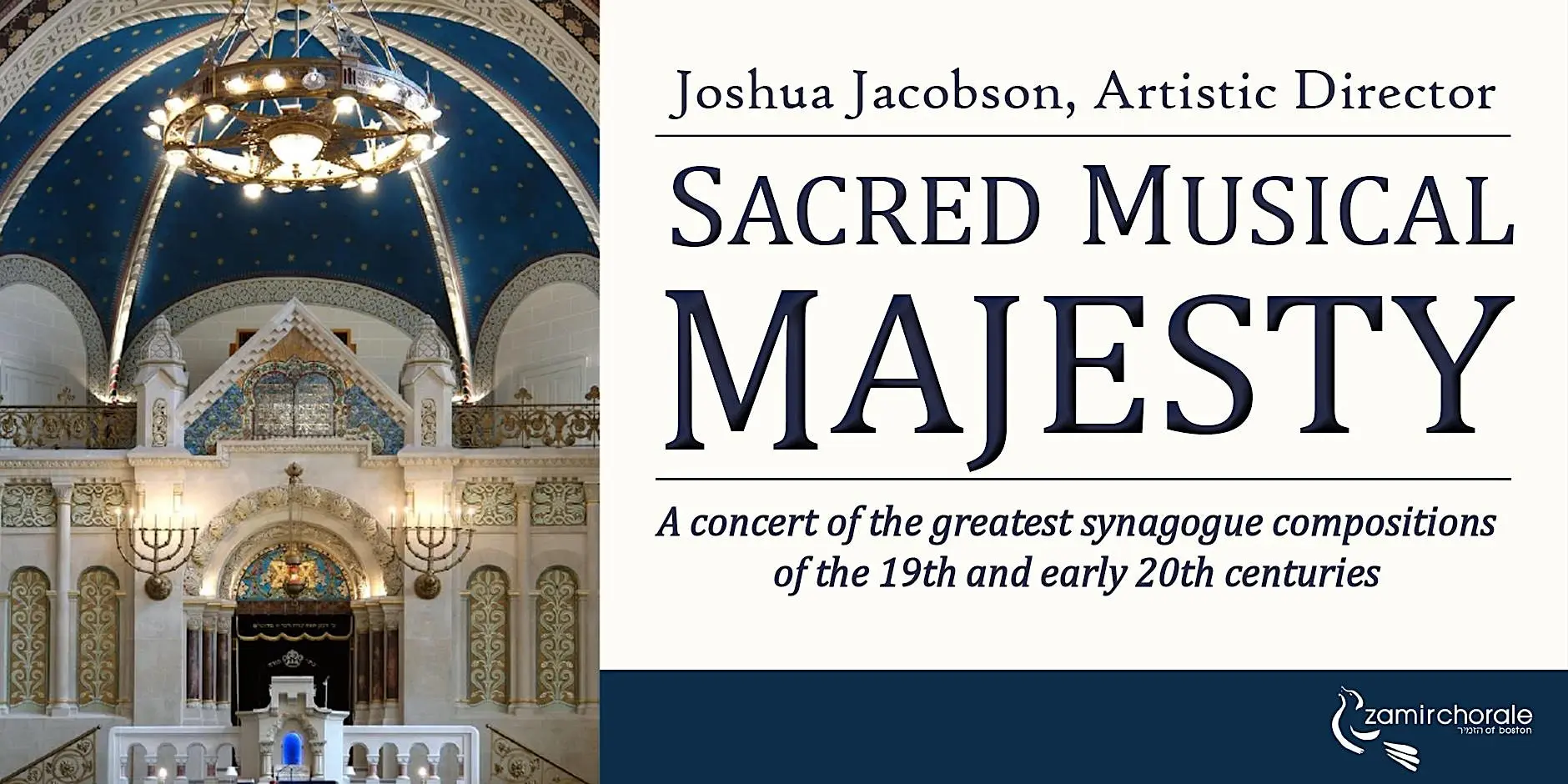 5:00 PM. Zamir Chorale of Boston [MA]: Sacred Musical Majesty. A concert of the greatest synagogue compositions of the 19th and early 20th centuries, including premiere performances of rediscovered liturgical masterworks by Cantor Helman Lieber. Joshua Jacobson, Artistic Director; Josh Breitzer, Cantor; Edwin Swanborn, organ. For more information, call 617-916-9469 or email manager@zamir.org. Central Reform Temple at Emmanuel Church, 15 Newbury Street, Boston MA 02116 (View flier) ⓘ 🔗