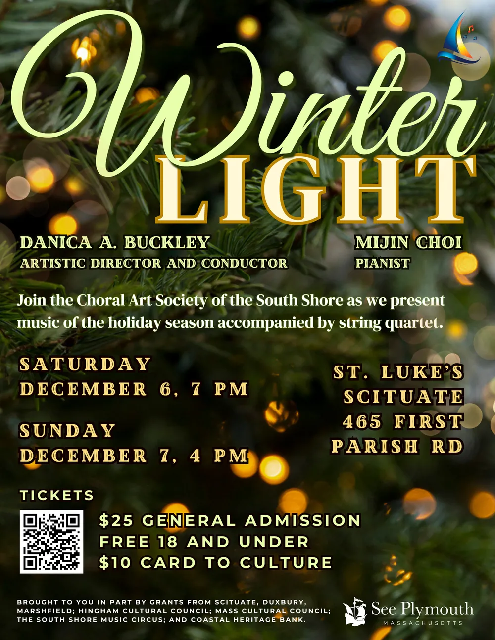 4:00 PM. Choral Art Society of the South Shore [MA]: Winter Light. We celebrate both tradition and discovery, with Handel’s "For Unto Us a Child Is Born", Bach’s Gloria in excelsis Deo, and songs including "Light in the Heart of Winter", "Night of Silence", "Winter Bluejay", as well as carols and seasonal favorites. For more information, call 781-925-6095 or email choralartsociety@yahoo.com. St. Luke's Episcopal Church, 465 First Parish Road, Scituate MA 02066 (View flier) ⓘ 🔗