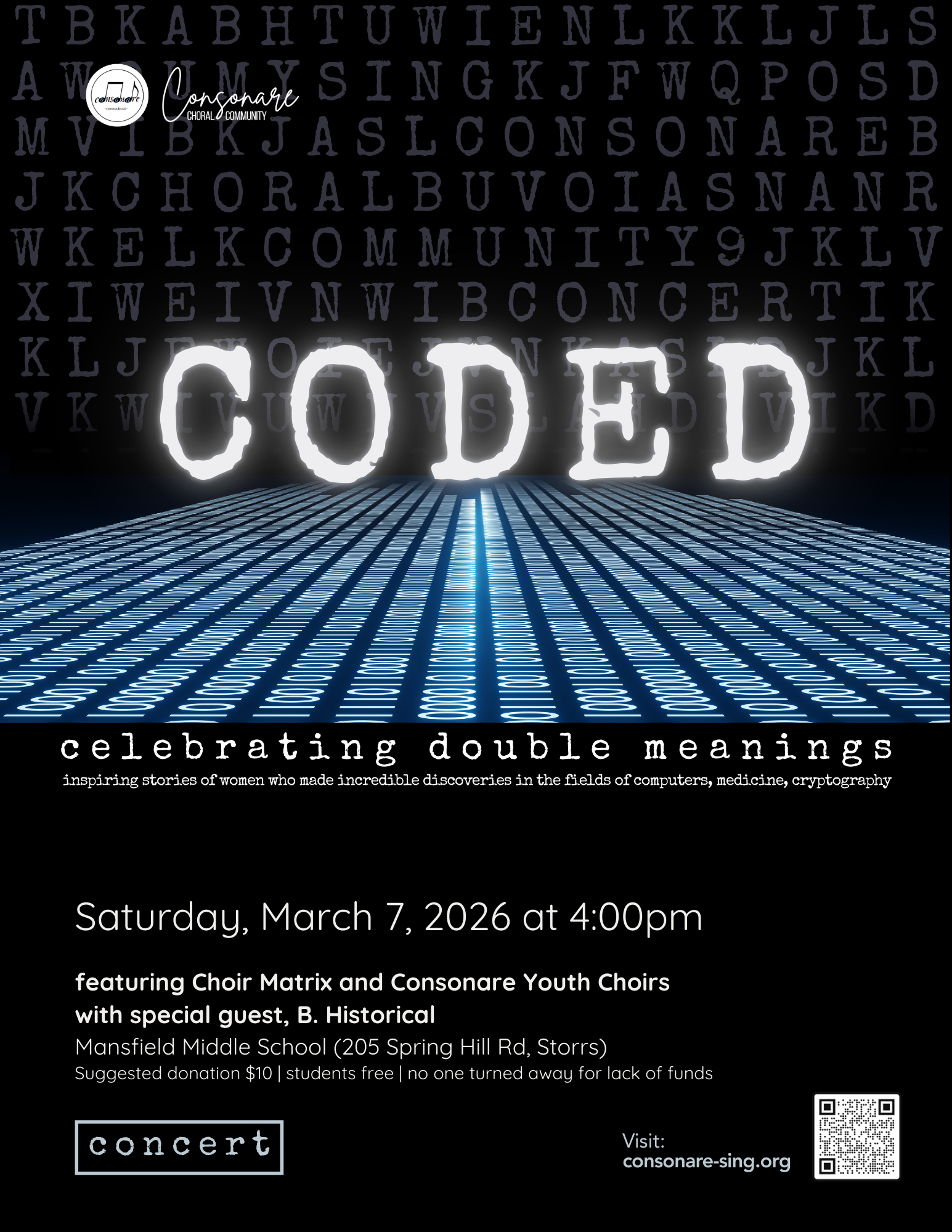 4:00 PM. Consonare Choral Community [CT]: Coded: celebrating double meanings. A concert telling the stories of women in the U.S. who made incredible discoveries in the field of computers, medicine and cryptography, through performances by Choir Matrix and Consonare Youth Choirs and a collaboration with B. Historical. A family-friendly event. Suggested donation: $10; students/children are free, no one turned away for lack of funds. For more information, email Consonare.sing@gmail.com. Mansfield Middle School, 205 Spring Hill Road, Storrs CT 06268 (View flier) ⓘⓘⓘⓘ 🔗