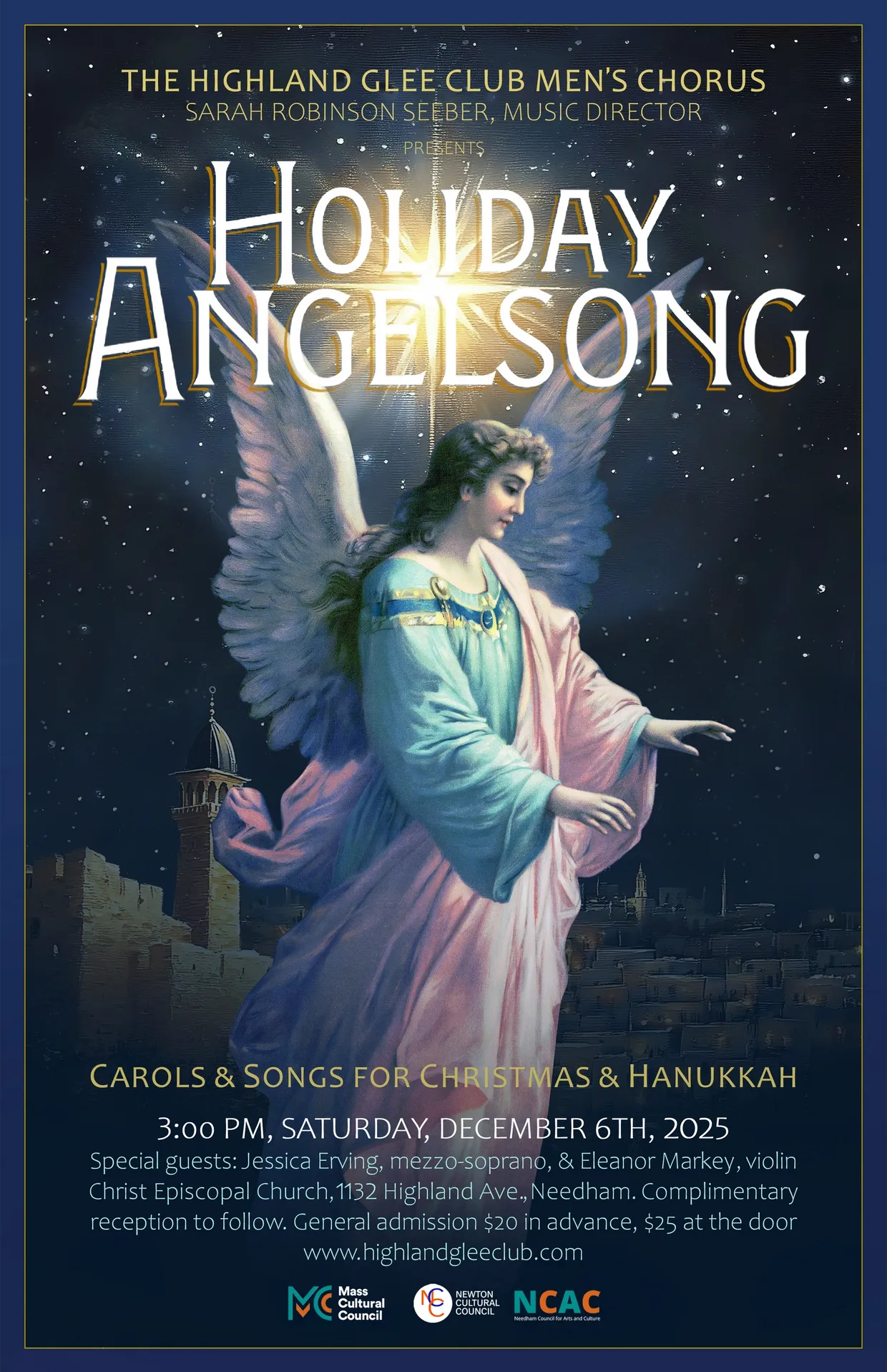 3:00 PM. Highland Glee Club [MA]: Holiday Angelsong. Holiday music by Palestrina, Franck, Schubert, Praetorius, Mendelssohn, Rubinstein, and Dan Wulf. Jessica Erving, mezzo-soprano; Connor Vigeant, tenor; Eleanor Markey, violin; Jonathan Reddix, accompanist; Sarah Robinson Seeber, Music Director. Tickets: $20 in advance, $25 at the door, free for children. Complimentary reception following concert. For more information, call 508-641-9985 or email highlandgleeclub@gmail.com. Christ Episcopal Church, 1132 Highland Avenue, Needham MA 02494 (View flier) ⓘ 🔗