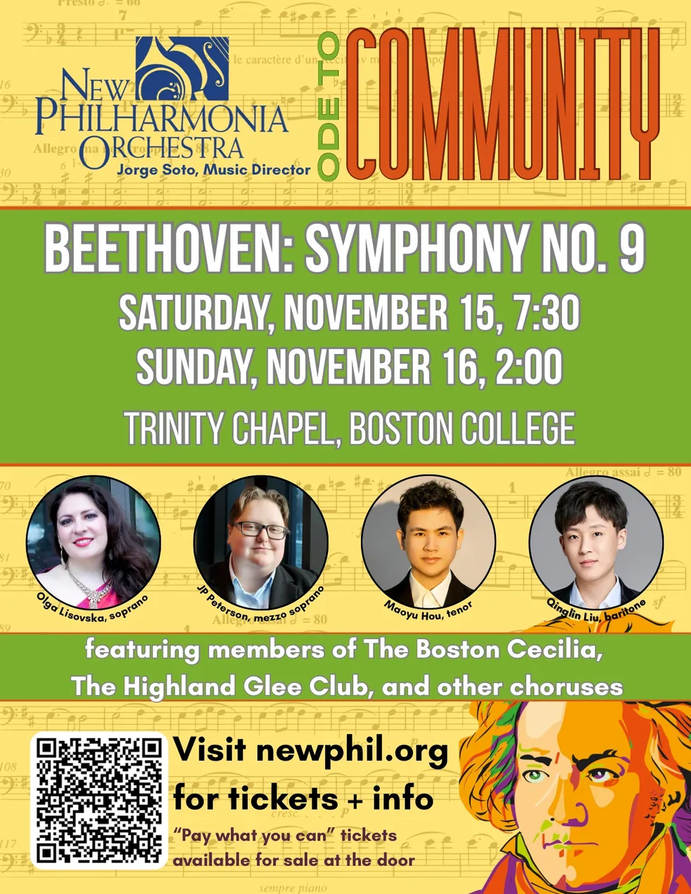 2:00 PM. New Philharmonia Orchestra / Boston Cecilia / Highland Glee Club [MA]: Classics I: Ode to Community. Ludwig van Beethoven: Symphony No. 9. Olga Lisovska, soprano; JP Peterson, mezzo-soprano; Maoyu Hou, tenor; Qinglin Liu, baritone. Tickets: $10-$45. For more information, email info@newphil.org. Trinity Chapel, Boston College, 885 Centre Street, Newton MA 02459 (View flier) ⓘⓘ 🔗