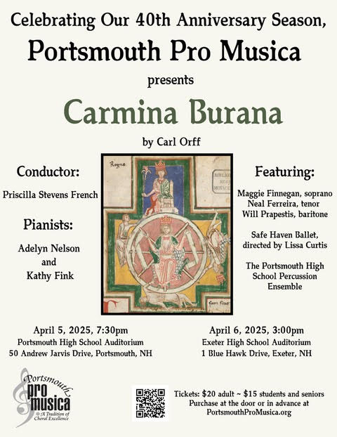 3:00 PM. Portsmouth Pro Musica [NH]: Carmina Burana. Carl Orf: Carmina Burana. Maggie Finnegan, soprano; Neal Ferreira, tenor; Will Prapestis, baritone. With Safe Haven Ballet. Tickets: $20 adults, $15 students/seniors. For more information, call 603-436-8154 or email info@ppmnh.org. Exeter High School Auditorium, 1 Blue Hawk Drive, Exeter NH 03833 (View flier) ⓘ 🔗