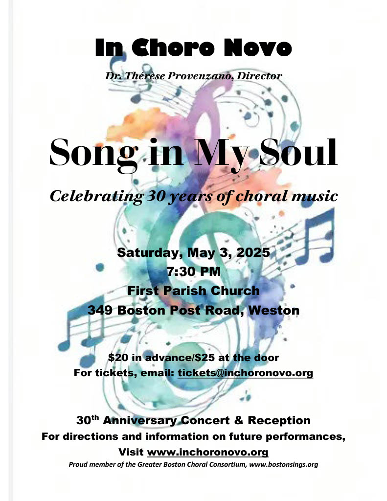 7:30 PM. In Choro Novo [MA]: Song in My Soul. 3oth anniversary concert and reception. Tickets: $20 advance, $25 at the door. Dr. Thérèse Provenzano, director. For more information, call 617-469-3705 or email info@inchoronovo.org. First Parish Church Of Weston, 349 Boston Post Road, Weston MA 02493 (View flier) ⓘ 🔗