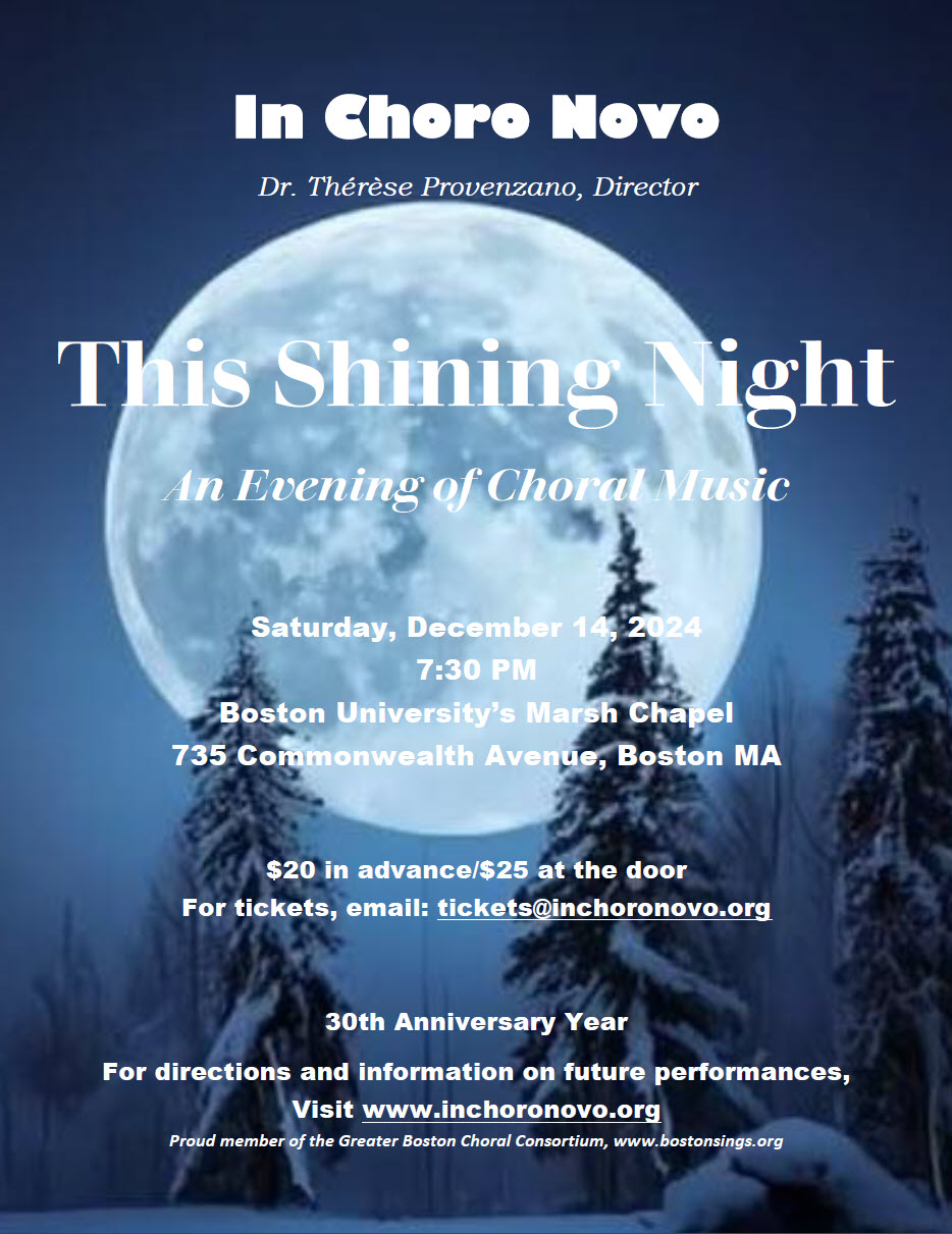7:30 PM. In Choro Novo [MA]: This Shining Night. Tickets: $20 advance, $25 at the door. For more information, call 617-469-3705 or email info@inchoronovo.org. Marsh Chapel, Boston University, 735 Commonwealth Avenue, Boston MA 02215 (View flier) ⓘ 🔗
