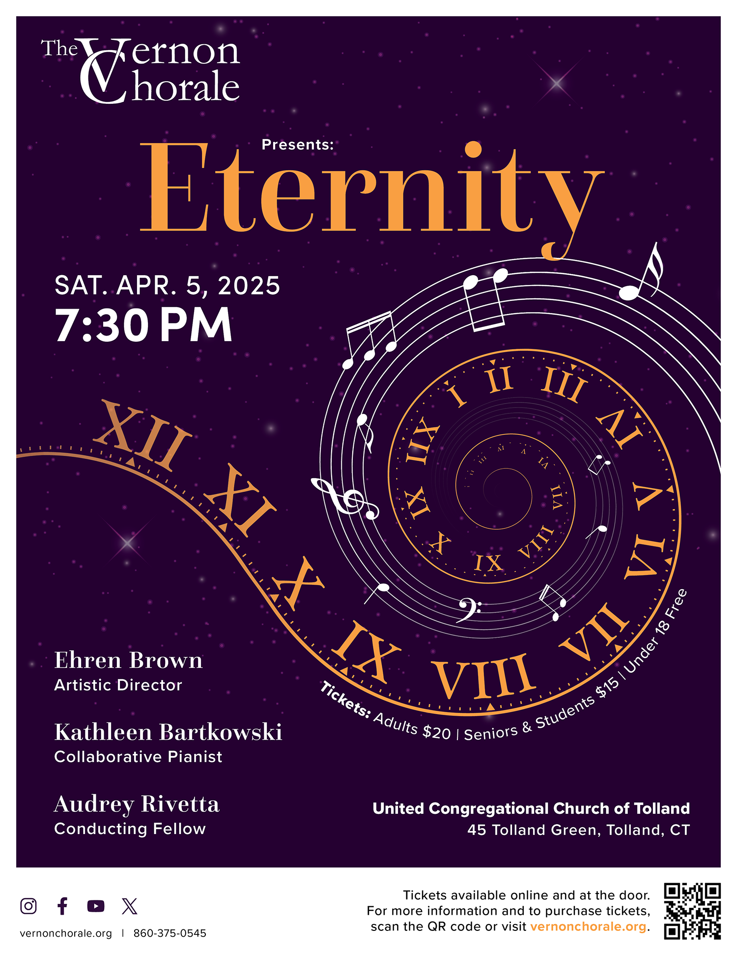 7:30 PM. Vernon Chorale [CT]: Eternity. Join us for an evening of music that will engage your curiosity and encourage us to ponder our relationship with the universe. For more information, call 860-375-0545 or email info@vernonchorale.org. United Congregational Church Of Tolland, 45 Tolland Green, Tolland CT 06084 (View flier) ⓘ 🔗