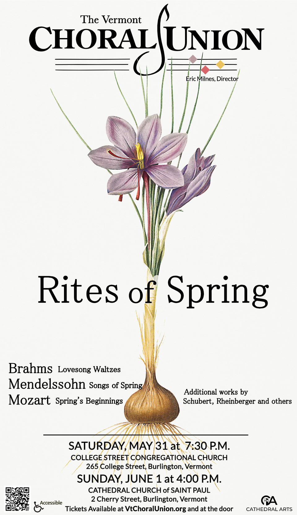 4:00 PM. The Vermont Choral Union [VT]: The Vermont Choral Union : Rites of Spring. A seasonal program of choral music by some of the greatest composers of 19th century Germany as well as wonderful new discoveries! Eric Milnes, director. For more information, call 802-989-7355 or email info@vtchoralunion.org. 2 Cherry Street, Burlington VT 05401 (View flier) ⓘ 🔗