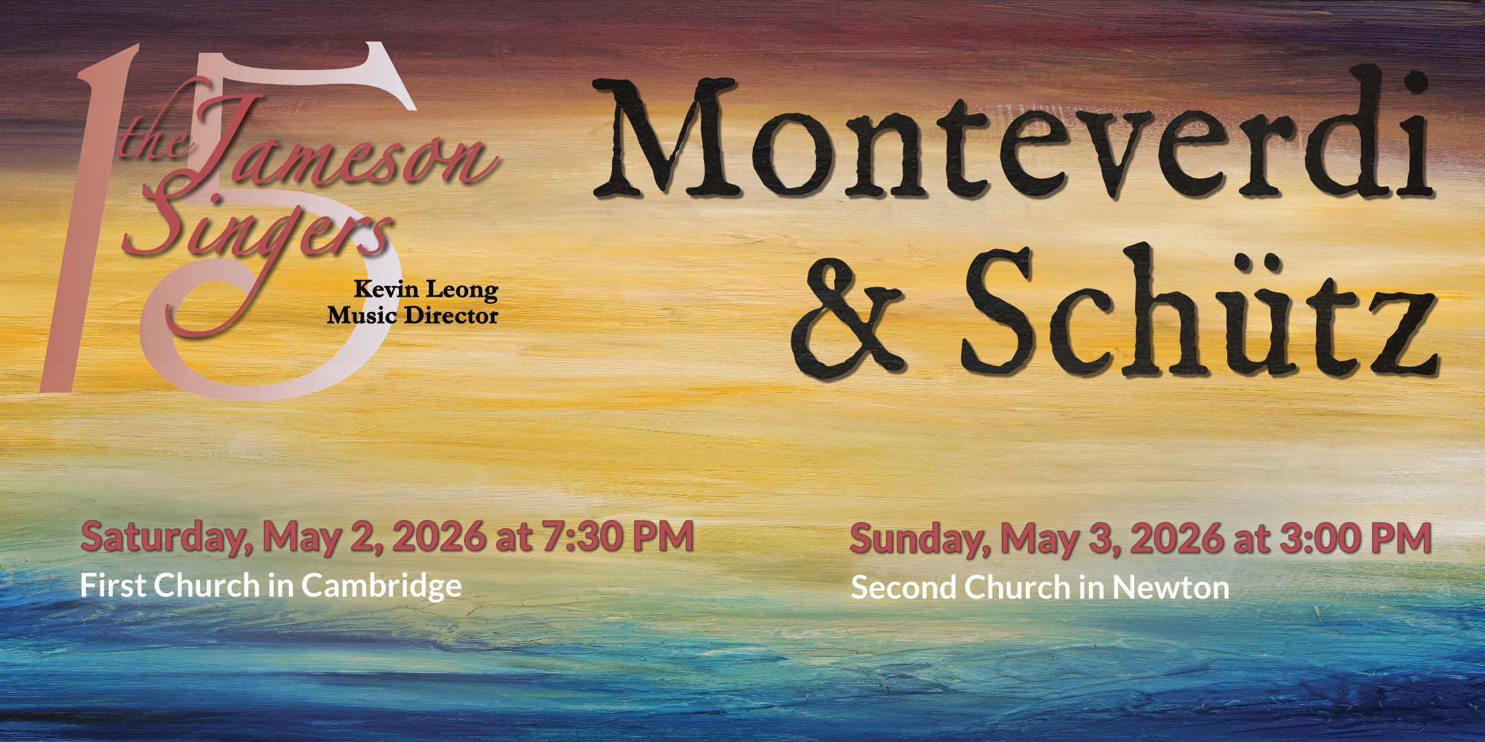 3:00 PM. The Jameson Singers [MA]: Monteverdi and Schutz. Claudio Monteverdi: Lagrime d’amante al sepolcro dell’amata; Heinrich Schütz: Das ist mir lieb; Robert Lucas Pearsall: Lay A Garland; Steven Sametz: Munus (written for Dr. Jameson Marvin); and more. In celebration of the group's 15th anniversary. For more information, call 617-209-9290 or email info@jamesonsingers.org. Second Church In Newton, 60 Highland Street, West Newton MA 02465 (View flier) ⓘ 🔗