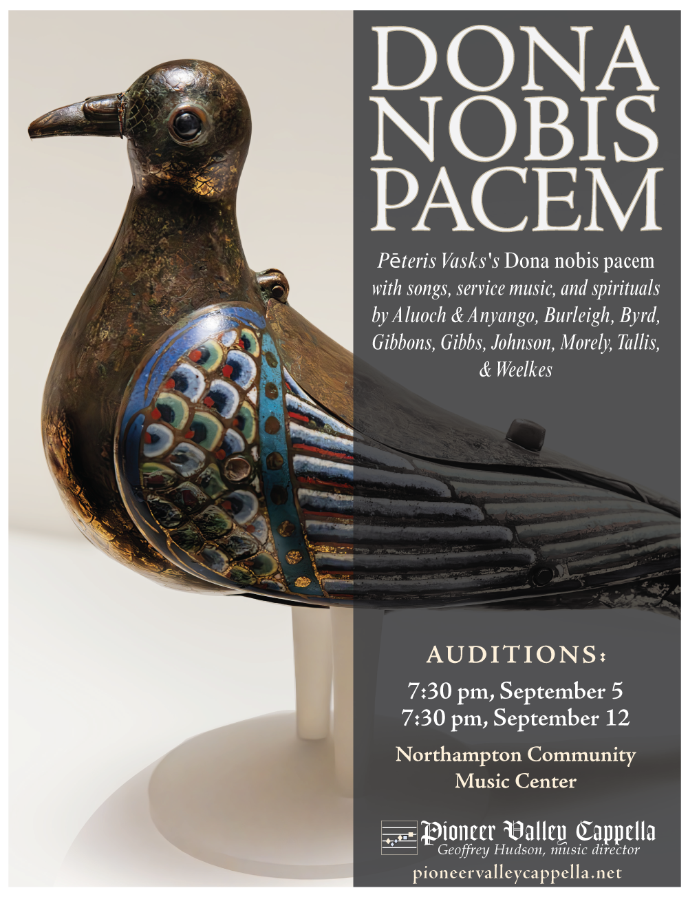 7:30 PM. Pioneer Valley Cappella [MA]: Fall Semester Auditions. Pioneer Valley Cappella (PVC) is a Northampton-based auditioned ensemble that has been performing unaccompanied choral music for over thirty years. Our fall concert pairs Pēteris Vasks's haunting Dona nobis pacem with songs, service music, and spirituals on the theme of peace by Aluoch & Anyango, Burleigh, Byrd, Gibbons, Gibbs, Johnson, Morely, Tallis, & Weelkes. Experienced singers are invited to join us for a rehearsal and audition on September 12. Auditions are friendly. Singers should have a short piece prepared, and be ready for simple exercises to determine voice part. For more information, email pioneervalleycappella@gmail.com. Northampton Community Music Center, 139 South St, Northampton MA 01060 (View flier) ⓘ 🔗