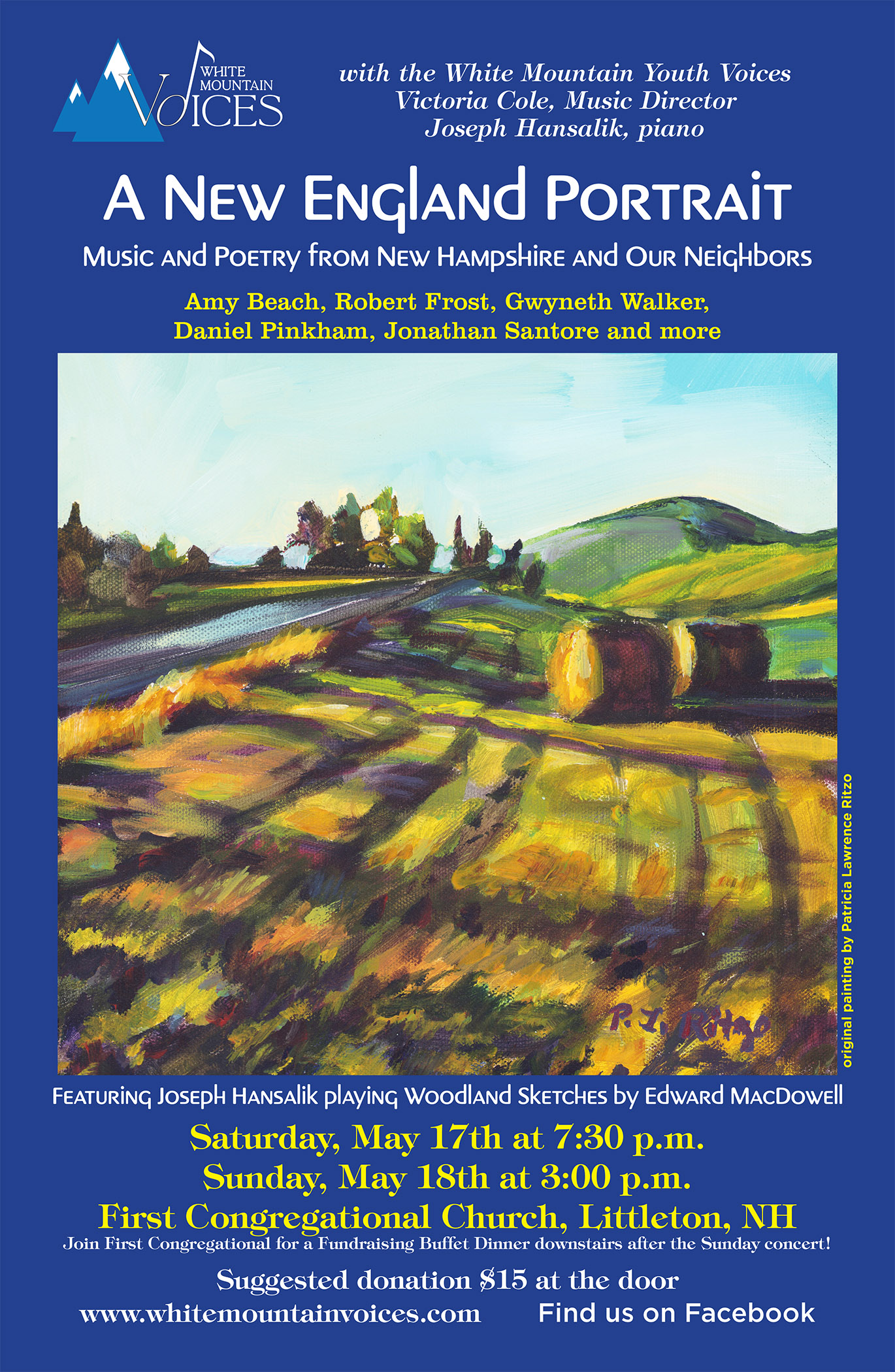 3:00 PM. White Mountain Voices [NH]: A New England Portrait. Music featuring New England poets (Frost, Kenyon, cummings, Longfellow) and composers (Santore, Beach, Walker, Pinkham). Suggested donation $15, under age 18 free. For more information, call 603-728-7022 or email artisticdirector@whitemountainvoices.com. First Congregational Church, 189 Main Street, Littleton NH 03561 (View flier) ⓘ 🔗