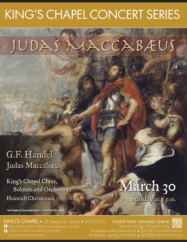 5:00 PM. King's Chapel Choir [MA]: Judas Maccabeus. G.F. Handel: Judas Maccabeus. Heinrich Christensen, director. With orchestra. Tickets: $25 ($20 advance), students/seniors $20 ($15 advance). For more information, call 617-227-2155 or email hchristensen@kings-chapel.org. Kings Chapel, 58 Tremont Street, Boston MA 02108 (View flier) ⓘ 🔗